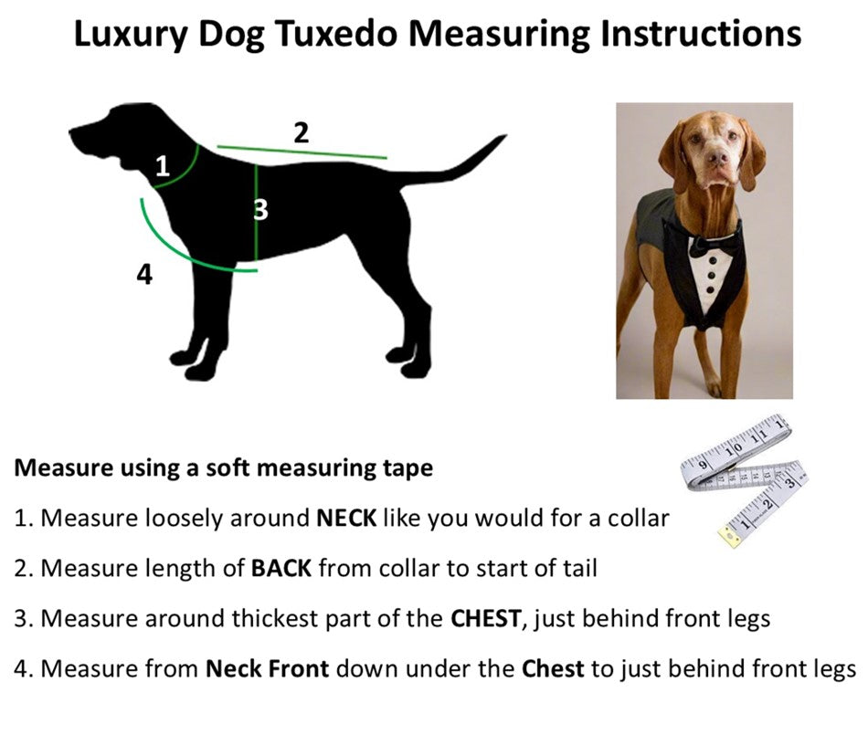 All Tuxedos are Custom made to measure. When Ordering, add your dog's measurements under PERSONALISATION. Check the (How to Measure Chart Photo)